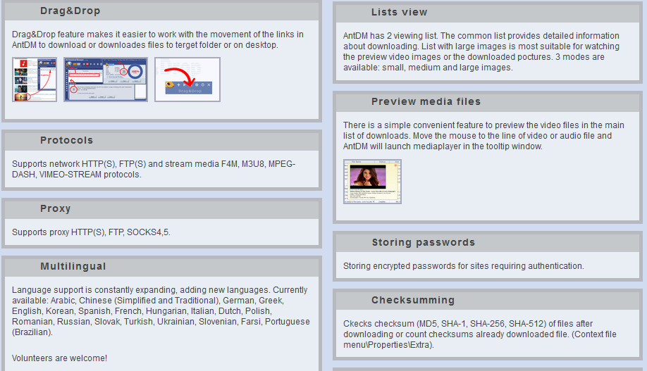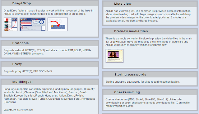 Drag & Drop এর মাধ্যমে আপনি ডাউনলোড যুক্ত করতে পারবেন আর কম বেশী অনেক প্রটোকল সাপোর্টেড যেমন Http, Https , FTP , F4M , M3U8 , Mpeg , Vimeo Stream আরো পাবেন প্রক্সি সুবিধা যা দিয়ে আপনি চাইলে ফ্রি নেট এ ডাউনলোড করতে পারবেন। আপনি চাইলে Ant Download Manager দিয়ে Picture কিংবা ভিডিও চালু করতে পারবেন। আর হ্যা সিকিউরিটি যদি চান তবে তো Ant Download Manager এর জোস একটা ফিচার হলো পাসওয়ার্ড ফাইল সিস্টেম।
